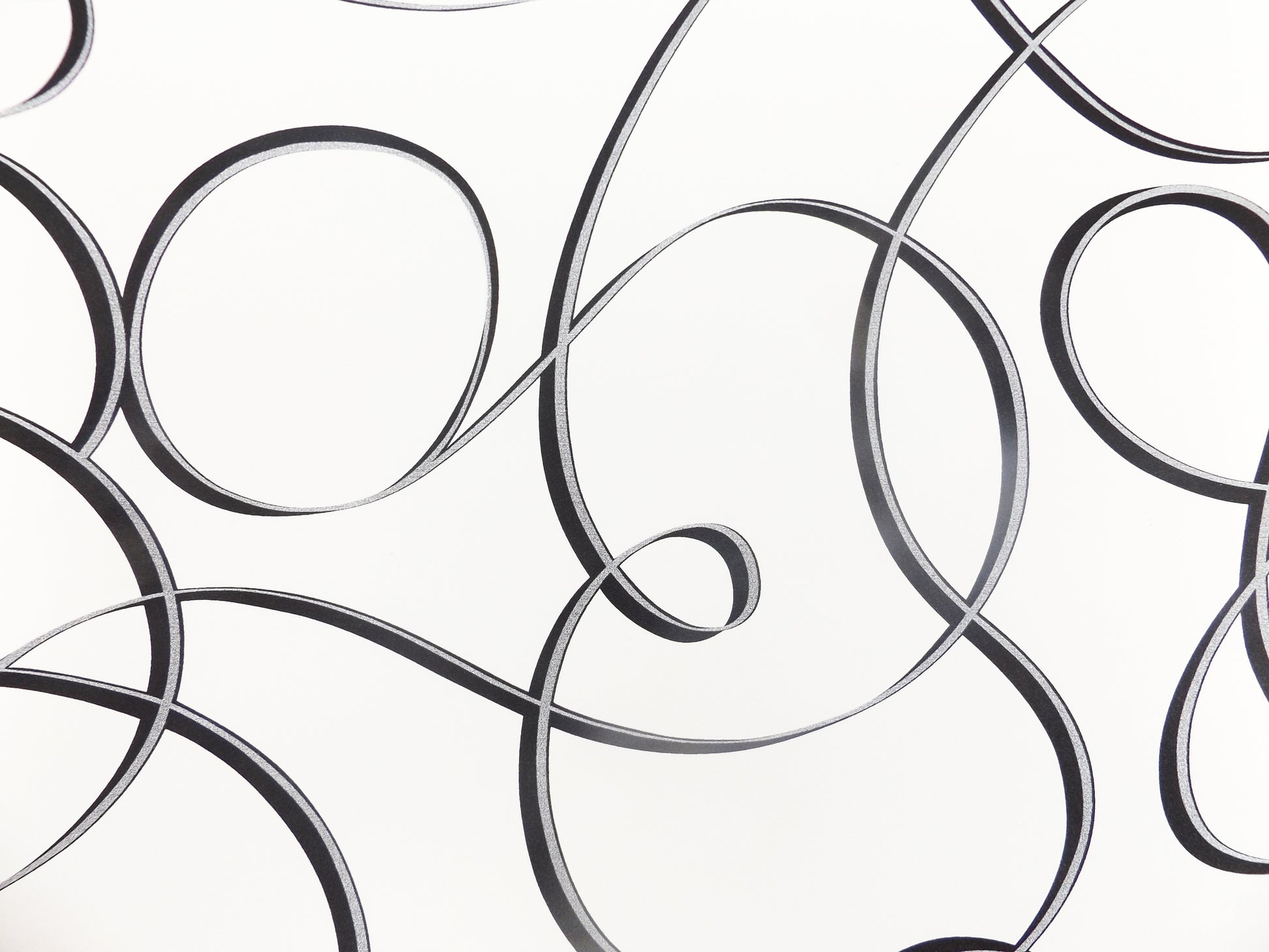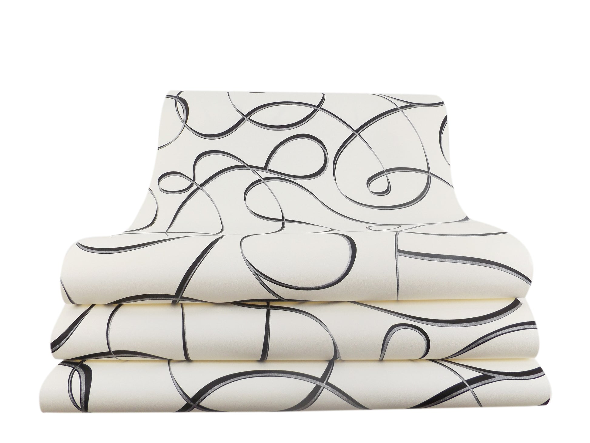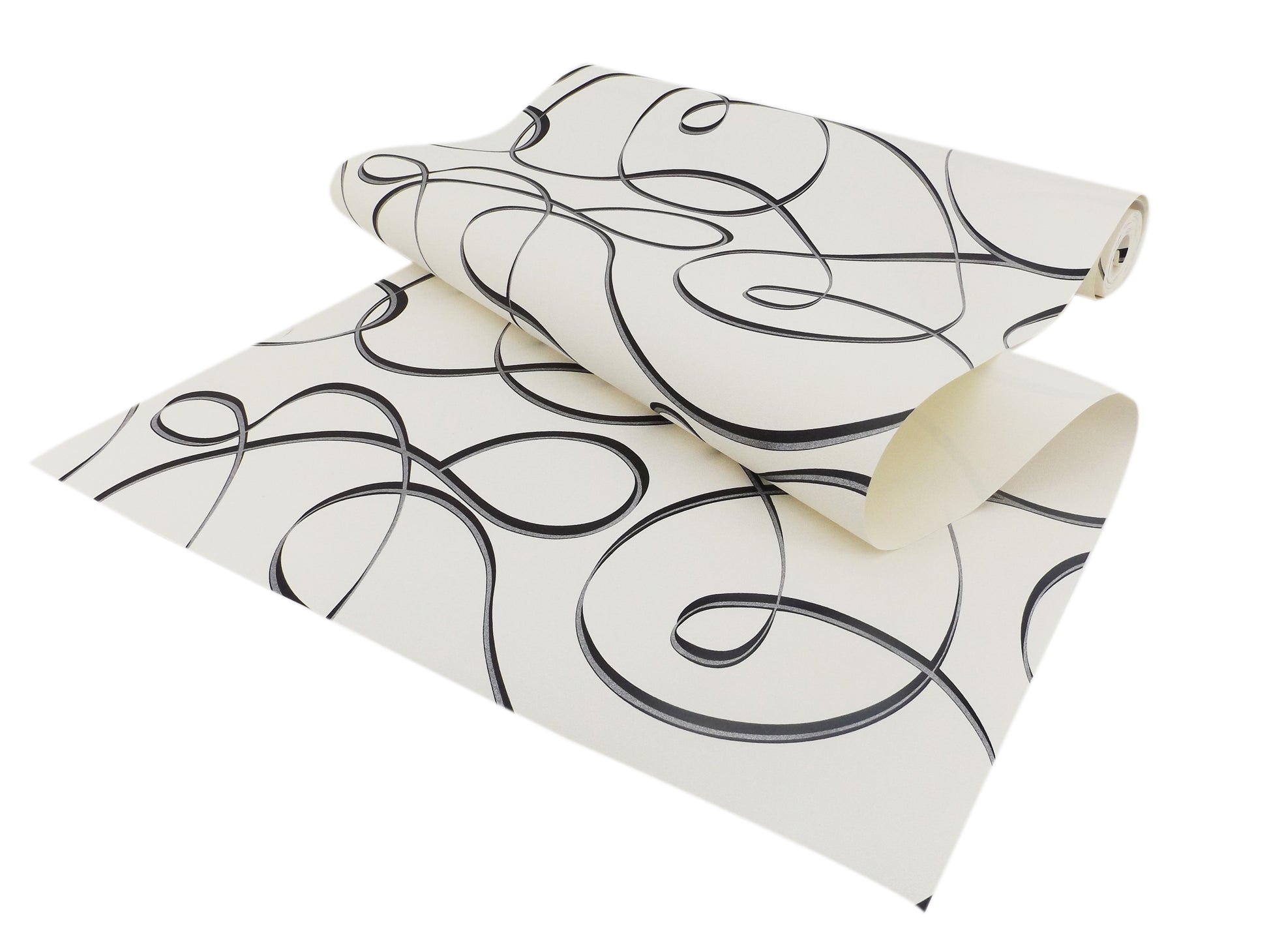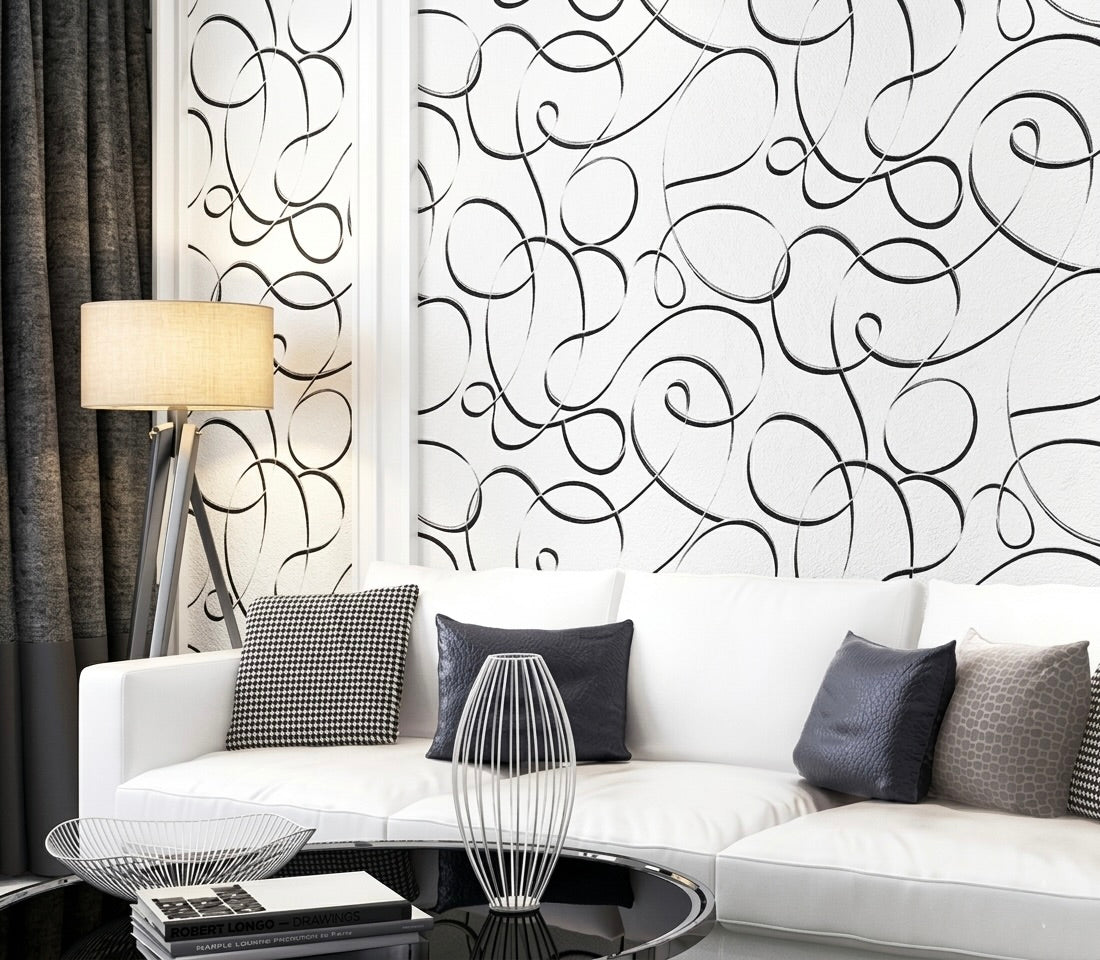 Líneas curvas y espirales en negro sobre fondo blanco crean un patrón dinámico y sofisticado que llena el espacio de movimiento y elegancia. Perfecto para salas y espacios modernos que buscan impacto visual sin sacrificar luminosidad. Combina con casi cualquier paleta de mobiliario.